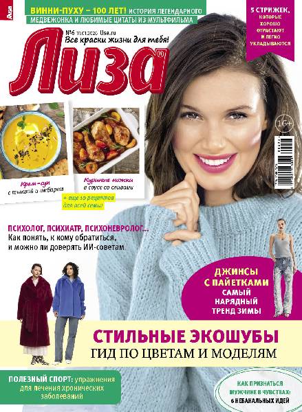 Самый популярный в России еженедельный журнал для молодых женщин «Лиза» стал еще интереснее, еще привлекательнее для читательниц. Теперь больше знаменитостей на страницах любимого журнала! Фитнес со звездой и звездный макияж, уроки стиля и самые горячие новости из жизни кумиров. А еще — модный шопинг, актуальная мода, новинки косметики и великолепные идеи для дома. Романтические истории о настоящей любви и рассказы читательниц о разных жизненных ситуациях. Аспекты психологии, секреты успешных отношений с окружающими и искусство сохранения любви. Консультации экспертов в области медицины и богатства природной аптеки. Лучшие кулинарные рецепты из редакционной коллекции. Увлекательные путешествия по России и всему миру.